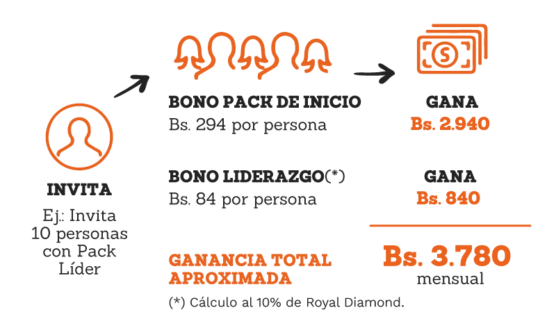 Gana dinero cada vez que incorporas a una nueva persona en tu equipo. Y otros bonos adicionales. Cálculos con beneficios del Pack Líder.